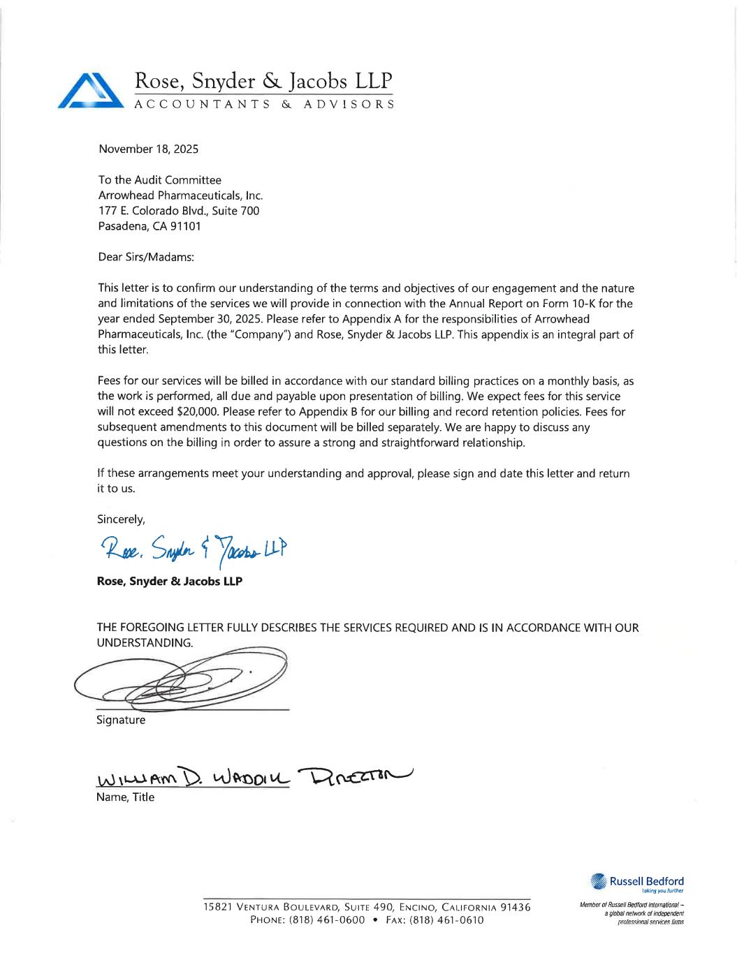 A signed original of these written statements required by 18 U.S.C. Section 1350 has been provided to Arrowhead Pharmaceuticals, Inc. and will be retained by Arrowhead Pharmaceuticals, Inc. and furnished to the Securities and Exchange Commission or its staff upon request.
